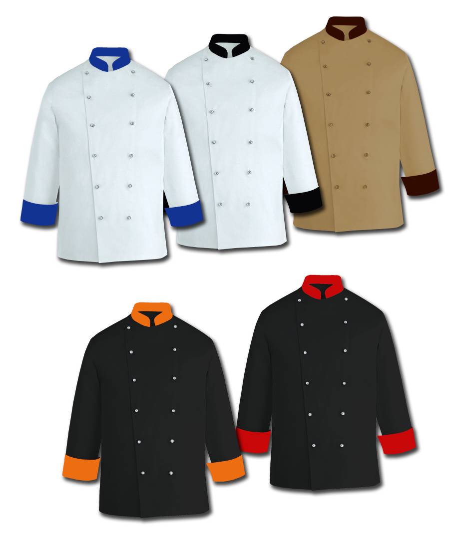 Μπλούζα μαγείρων μακρυμάνικη, χρωματιστό γιακα και μανσέτα και κούμπωμα με περαστό κουμπί πιπίλα. (*Υπάρχει δυνατότητα επιλογής χρώματος κουμπιού.)